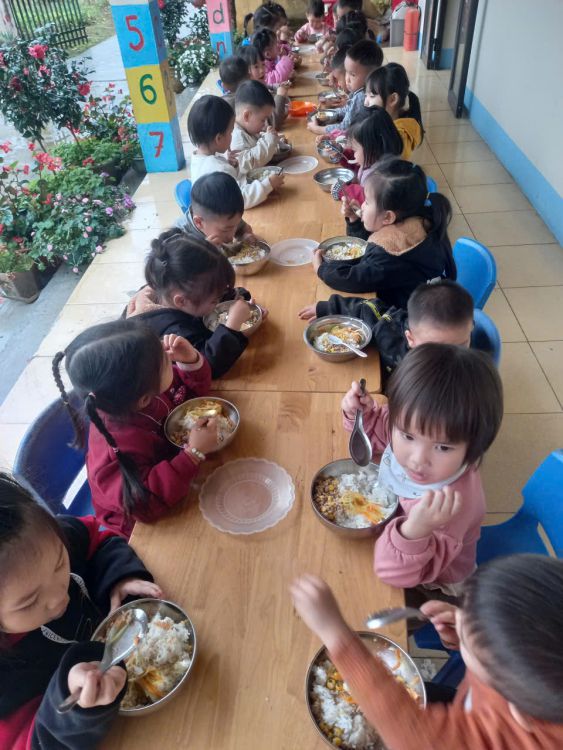 Trong giờ ăn, các bé ngồi ngay ngắn bên bàn, tự xúc cơm gọn gàng. Bữa ăn đầu xuân đầy đủ dinh dưỡng giúp các con nhanh chóng lấy lại nhịp sinh hoạt. Nhiều bé ăn ngon miệng, vui vẻ trò chuyện cùng bạn, thể hiện sự thích nghi tốt khi quay trở lại trường.
